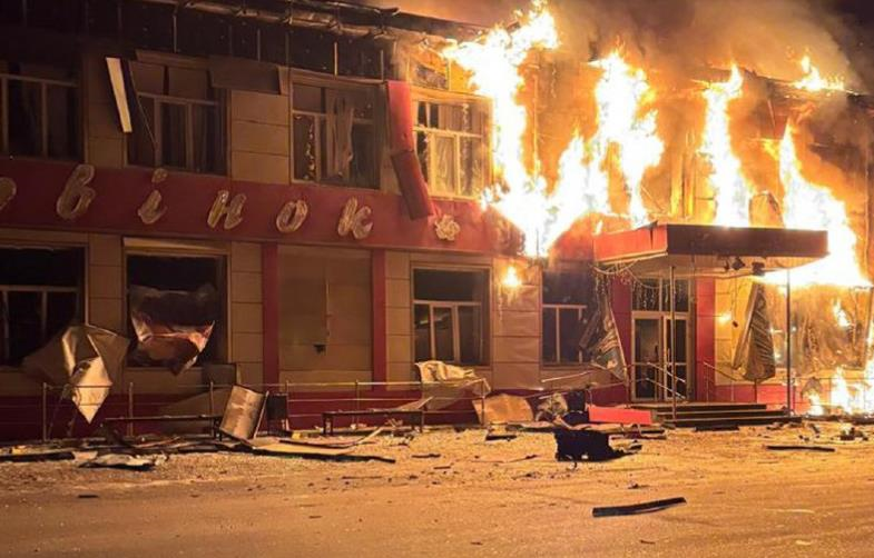 Зазначається, що внаслідок влучання загорівся двоповерховий магазин.