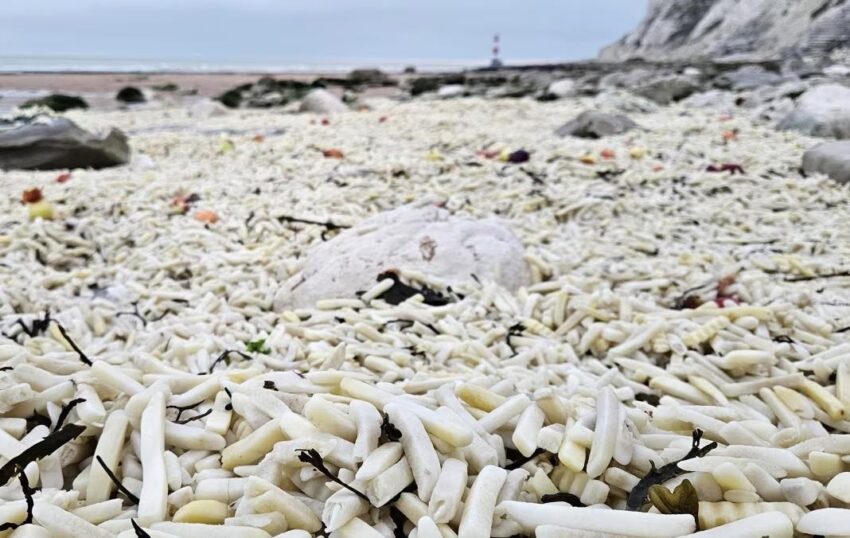 На пляжу на південному сході Англії виявили тисячі кілограмів картоплі фрі та цибулі, які випали з контейнеровозів під час шторму. Це стало загрозою для мешканців моря, які можуть помилково вважати це їжею. Люди почали прибирати пляж і збирати пластикове пакування, але також помітили, що тюленів, які живуть поблизу, може загрожувати це забруднення. Екологи відзначили серйозну загрозу для морських тварин. Рятувальні операції проводяться для очищення пляжу та відшукання втрачених контейнерів з харчовими продуктами.